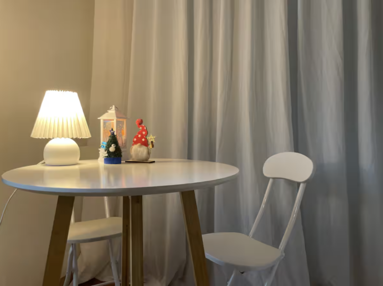 It's a warm space where you can gently put down the weight of the day. Calm lights, simple desks and cozy bedding greet you quietly, and a bowl of sin